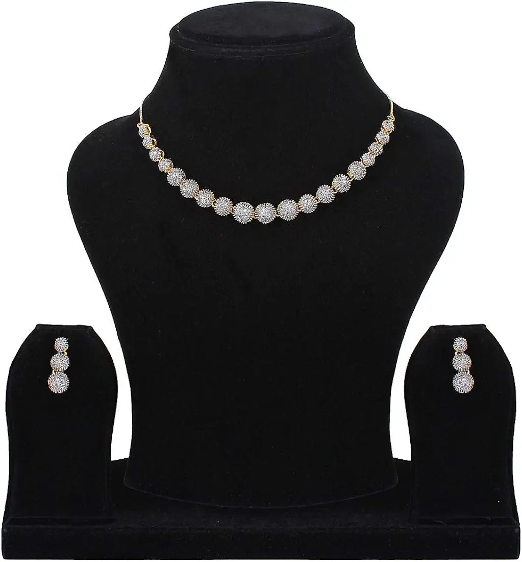 Enhance your ethnic look with the Stylish Traditional Jewellery Combo. Crafted from premium brass and adorned with sparkling American diamonds, this elegant choker set includes a necklace, earrings, ring and bracelet. Ideal for weddings, anniversaries, birthdays and festive celebrations.