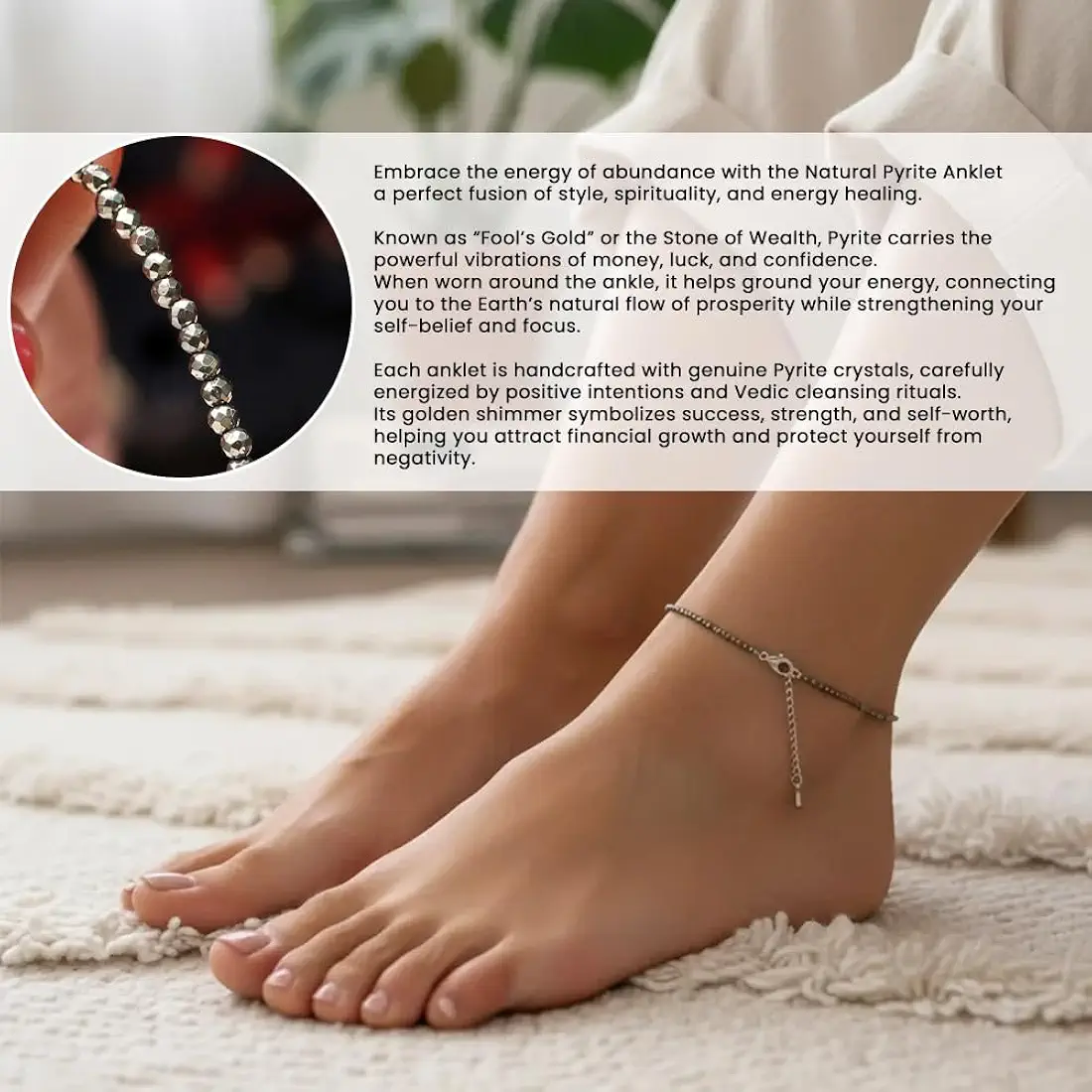 Experience spiritual elegance with the SIMPLY JEWELLERS natural pyrite anklet. Designed with faceted round pyrite beads in a metallic gold tone, this anklet is believed to promote positivity and protection. Featuring a comfortable hook and loop clasp, it is suitable for daily spiritual wear by both men and women. Thoughtfully crafted in India using untreated natural stones.